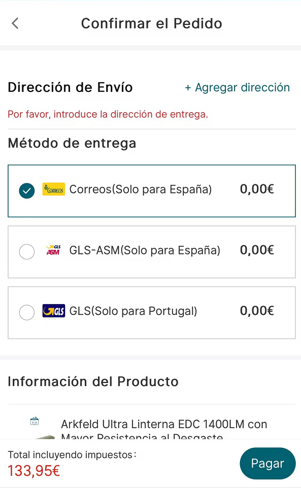 Olight España ofrece tres métodos de envío: Correos y GLS.