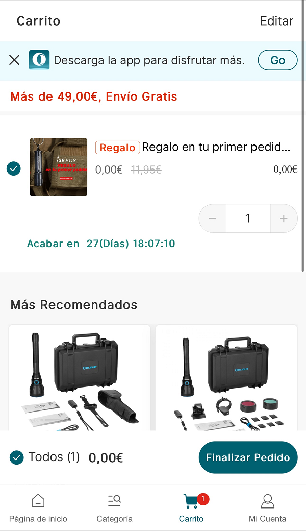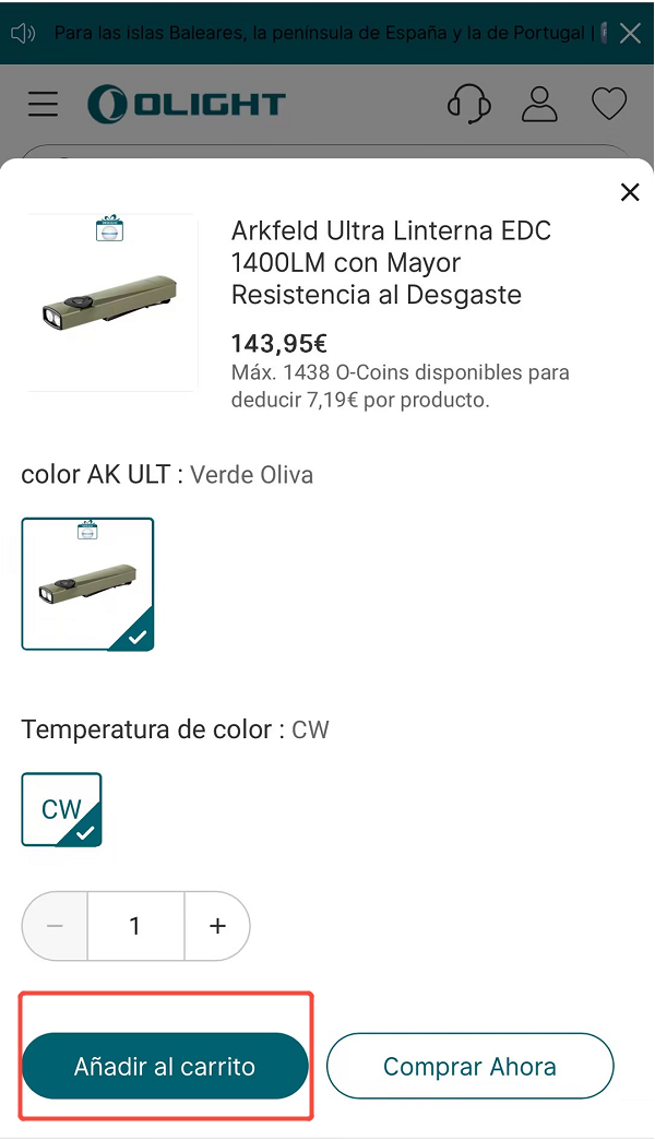 Si encuentras dificultades en el pago, puedes ponerte en contacto con el servicio al cliente por e-mail: cs.es@olight.com