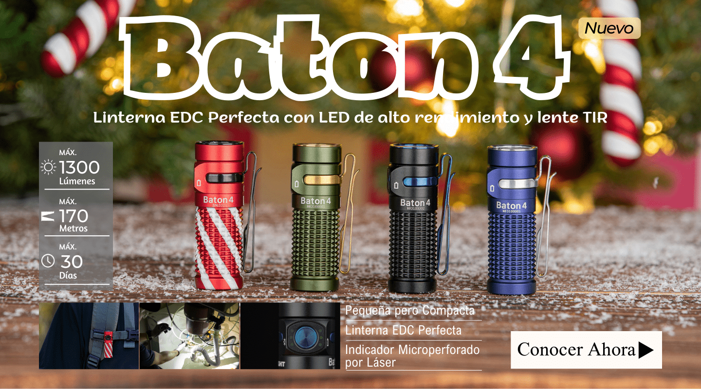 La Baton 4 es la versión actualizada de la conocida Baton 3 de Olight. Proporciona 1300 lúmenes y tiene un alcance de 170 metros. Es pequeña pero potente, perfecta para el uso diario. La linterna tiene un indicador microperforado por láser que muestra de forma intuitiva el brillo restante y la duración de la batería. Funciona con una batería recargable personalizada de iones de litio de 650 mAh y puede durar hasta 30 días en modo de luz luna. La textura antideslizante mejorada tiene un aspecto exquisito y mejora el agarre. La Baton 4 es la linterna de bolsillo definitiva en cuanto a rendimiento y comodidad.