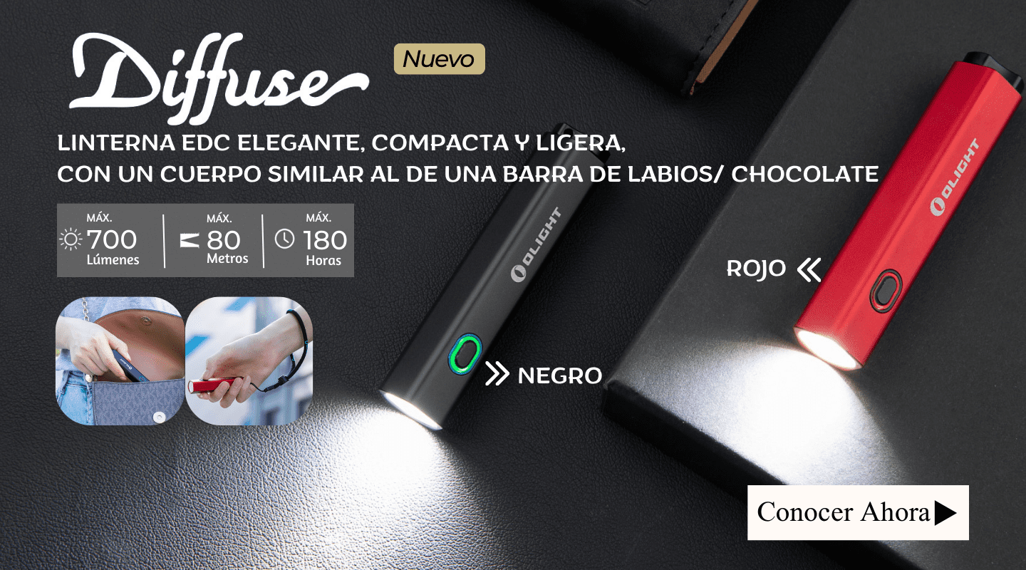 Diffuse es una linterna EDC elegante, compacta y ligera con una potencia máxima de 700 lúmenes. Sus 6 modos diferentes pueden satisfacer la mayoría de las necesidades de iluminación diarias. Gracias a su tamaño compacto, similar al de una barra de labios, Diffuse puede llevarse fácilmente en el bolsillo para mayor comodidad. Con un excepcional cuerpo en forma de prisma pentagonal, se acomoda bien a la mano. Diffuse tiene su interruptor lateral envuelto por un creativo indicador de encendido de 3 colores, que muestra la energía restante de forma intuitiva. Su amplio rango de voltaje de trabajo lo hace compatible con todas las pilas AA. Es, sin duda, una opción ideal para una linterna de uso diario.