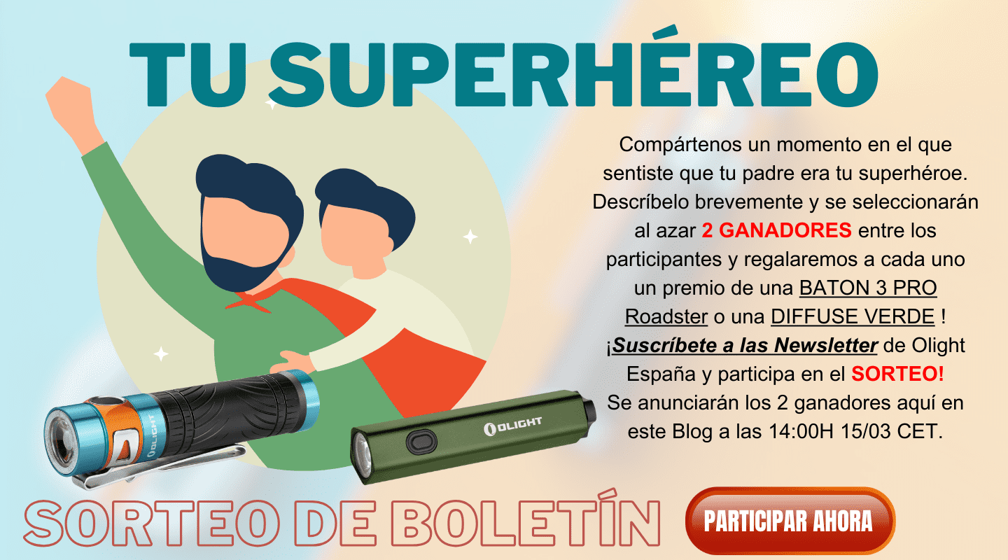 Compartenos un momento en el que entiste que tu padre era tu superheroe. Describelo brevemente y se seleccionaran al azar 2 GANADORES entre los participantes y regalaremos a cada uno un premio de una BATON 3 PRO Roadster o una DIFFUSE VERDE ! Suscribete a las Newsletter de Olight España y participa en el SORTEO! Se anunciaran los 2 ganadores aqui en este Blog a las 14:00H 15/03 CET