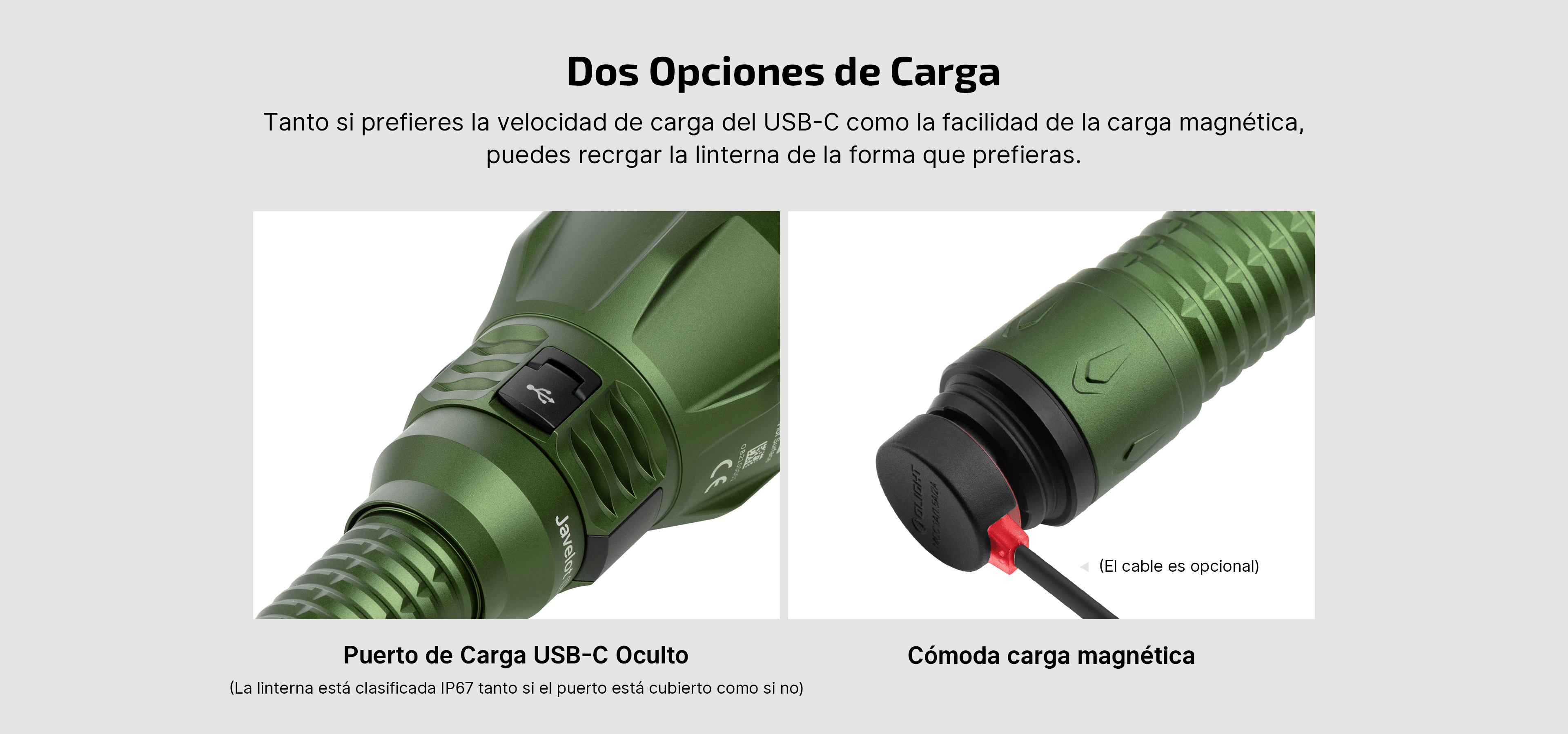 Con dos opciones de carga – USB-C y carga magnética –, esta linterna garantiza máxima flexibilidad y comodidad, adaptándose a cualquier situación.
