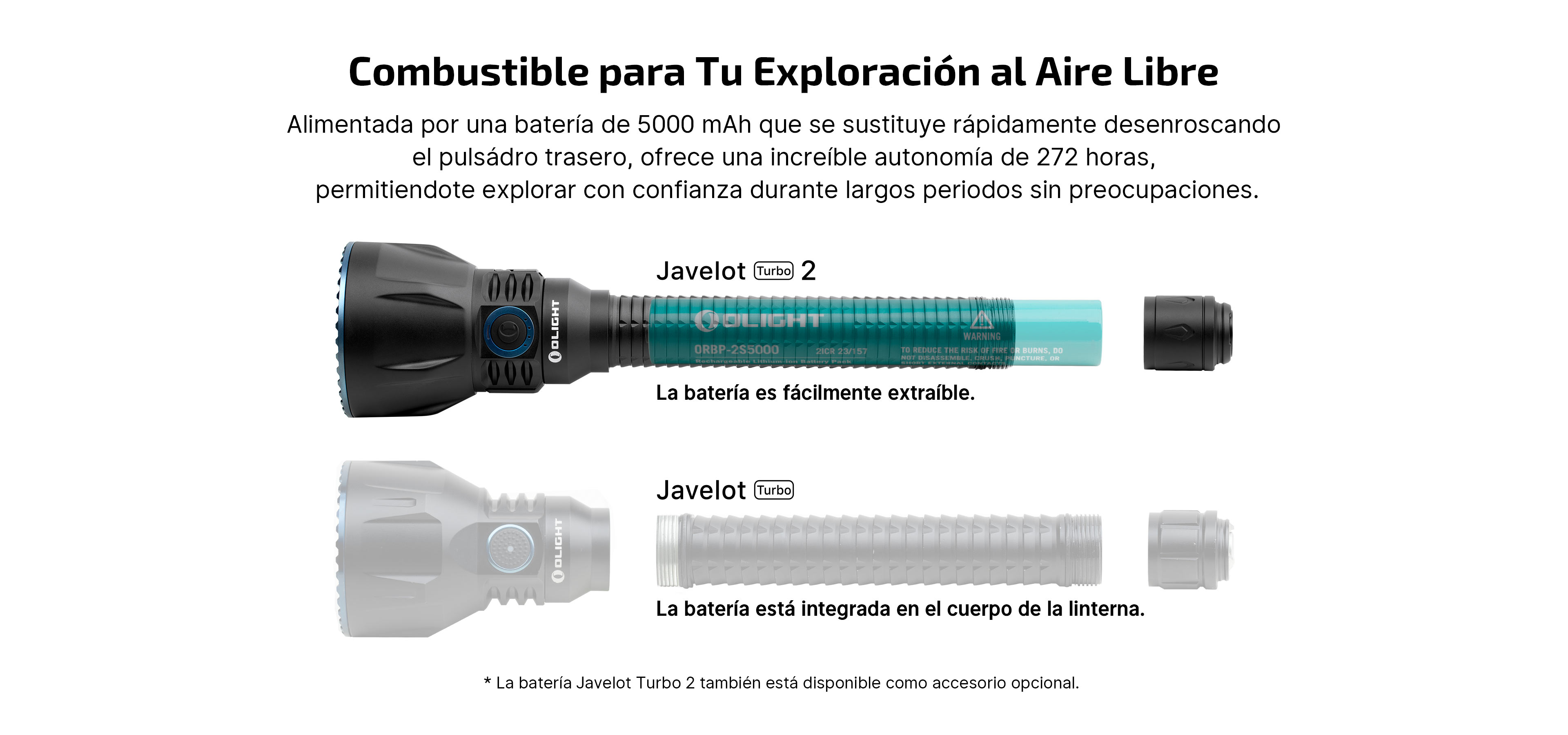 ✔ Autonomía Extraordinaria y Batería Sustituible: Equipada con una batería de 5000 mAh, la Javelot Turbo 2 ofrece hasta 272 horas de uso en su potencia más baja, asegurando un rendimiento prolongado en cualquier situación. Además, su diseño permite un reemplazo rápido y sencillo: solo hay que desenroscar la tapa trasera para intercambiar la batería y seguir adelante sin demoras.